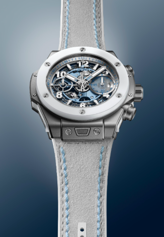 Ambos modelos tienen un tamaño de 42 mm e incorporan el sistema One Click de Hublot con dos correas intercambiables en piel de becerro forrada de caucho blanco radiante o azul hielo, para pasar del modo pista al modo noche en cuestión de segundos.